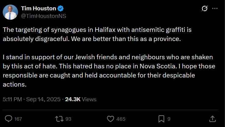 Nova Scotia “opposes” antisemitism the same way it “opposes” homophobia: with ribbons, hashtags, and statements that cost less than printer ink. Until one more window is smashed, one more couple is attacked, or one more synagogue is desecrated—then we’ll issue another tweet.