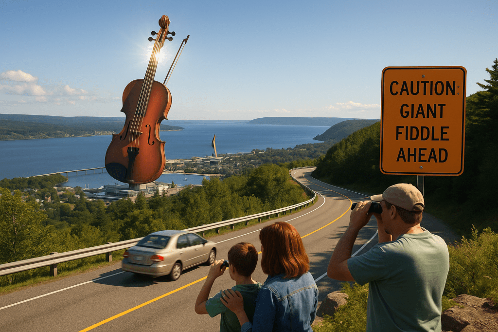 The new Mega-Fiddle, standing over 400 feet tall, will require strings the size of tugboat cables and a bow strong enough to knock Volkswagens into the harbour during windy conditions. Officials say the project will “pay for itself” in tourism, cruise ship selfies, and fiddle-related spinoffs.