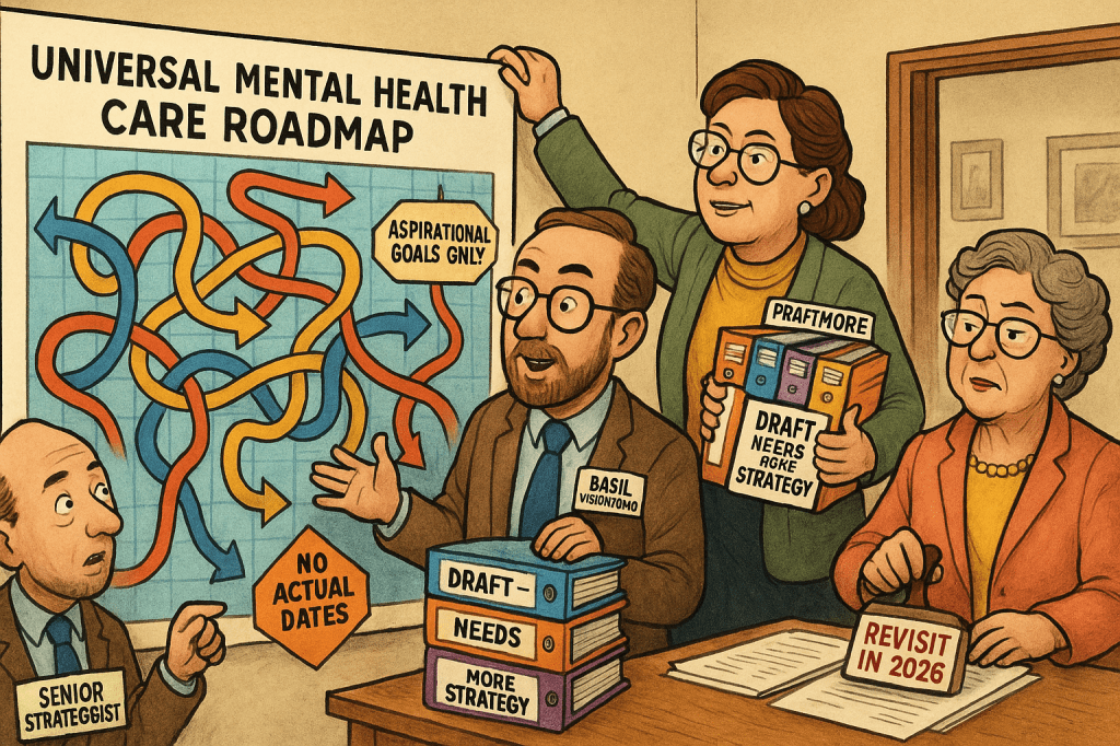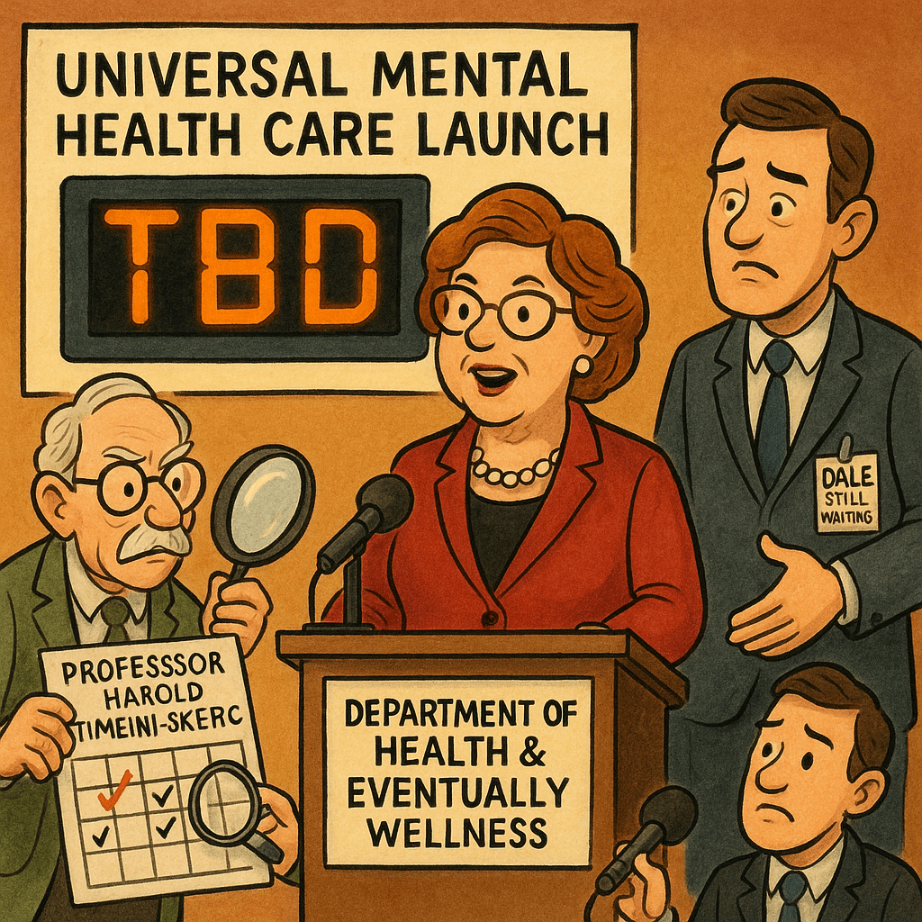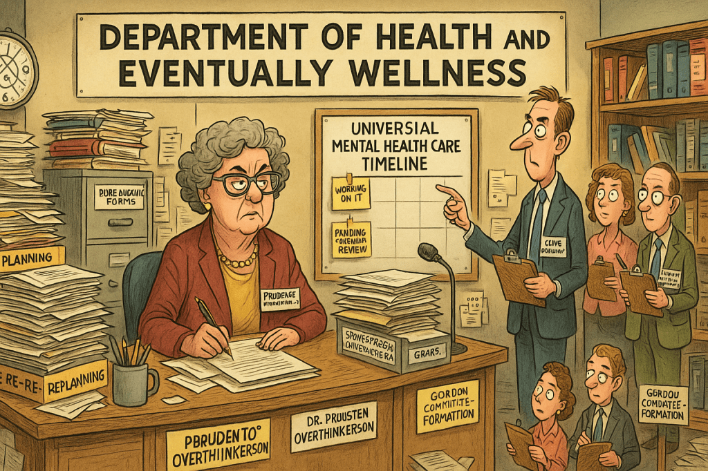 The Department of Health and Eventually Wellness, led by Deputy Minister Dr. Prudence Overthinkerson, today reaffirmed its commitment to universal mental-health care—a program announced in 2021 and currently entering what staff refer to as “Phase 7: More Thinking.”