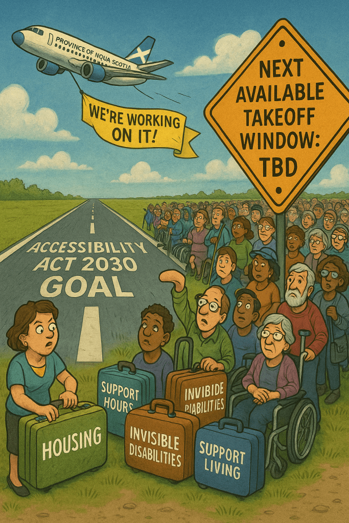 The Province reaffirms our dedication to helping all Nova Scotians with disabilities by 2030. Or whenever is most convenient after that. The Accessibility Act gives us lots of runway, and we intend to use every inch of it, taxi at low speed, and potentially circle the runway several times before taking off.